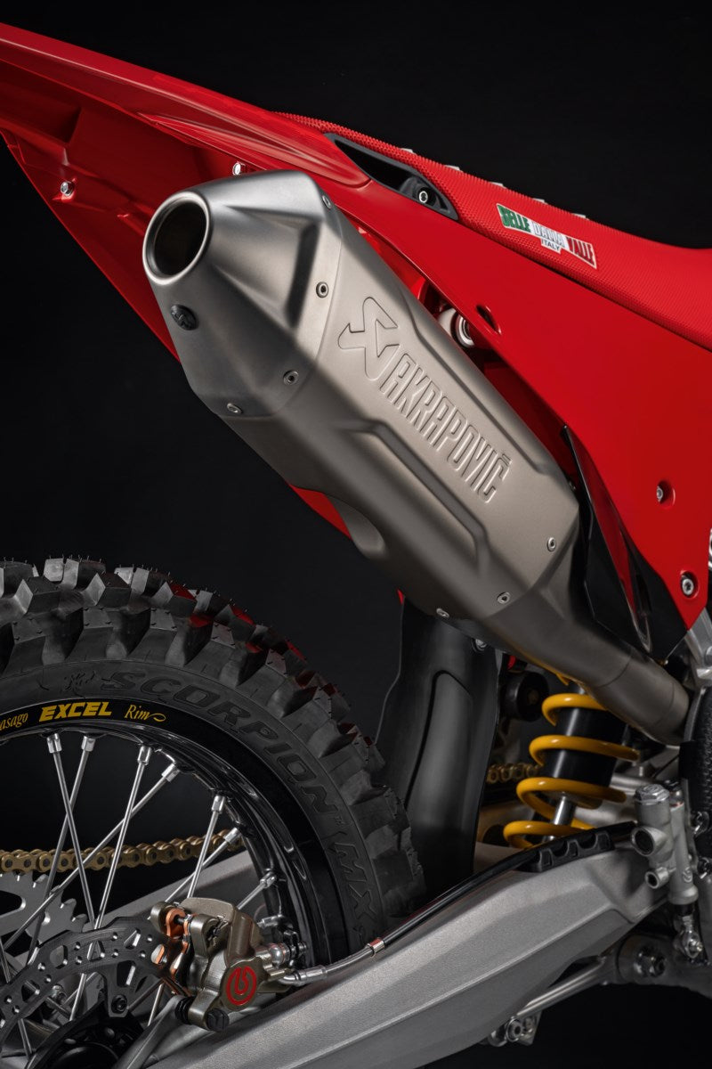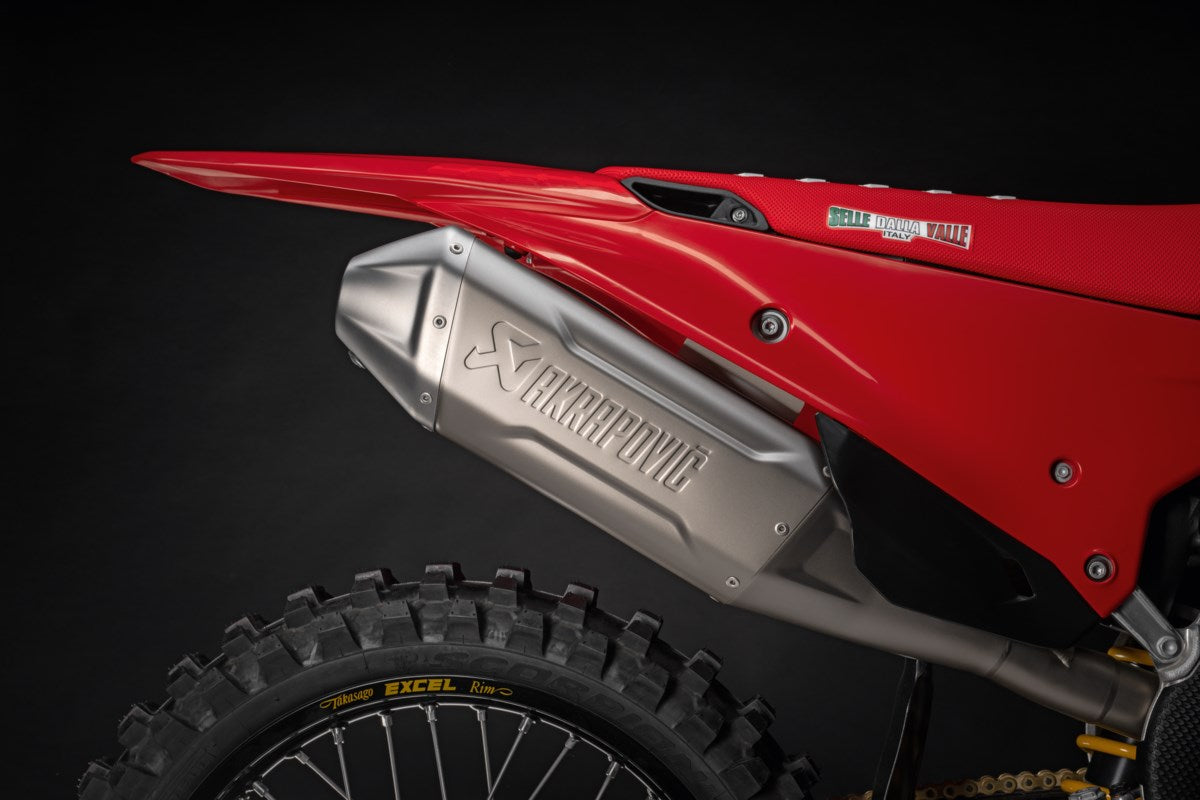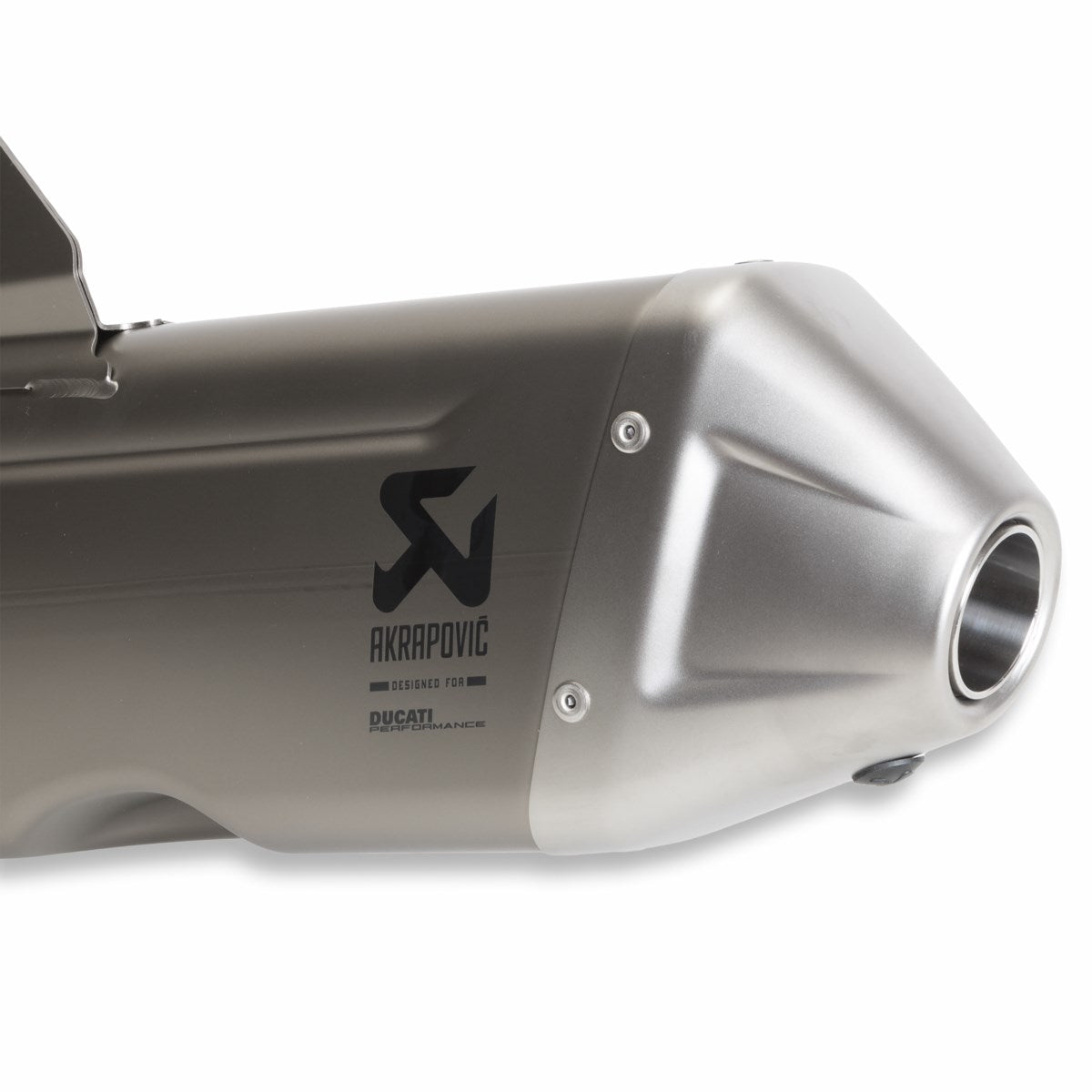 Leggerezza senza precedenti e altissima qualità sono le caratteristiche di questo componente realizzato in una speciale lega di titanio e derivato dall'esperienza maturata sui circuiti in gara. Gli spessori delle varie sezioni sono studiati per consentire un risparmio di peso di ben 1,7 kg, rispetto all’impianto di scarico di serie, e sempre nel rispetto dei limiti fonometrici imposti da FIM e AMA. L’accurato lavoro di calibrazione ha permesso di ottenere una curva di erogazione più piena e un regime di utilizzo ulteriormente ampliato, per una maggiore prontezza di risposta del motore e prestazioni da fuori classe per un divertimento dal sapore racing in puro DNA Ducati.